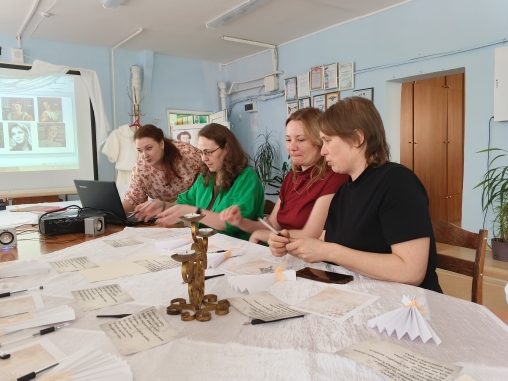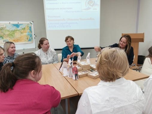 Бурными аплодисментами встретили учителя победителей номинации «Учитель ООО, СОО» Чурину Татьяну Сергеевну, учителя русского языка и литературы МАОУ «Гимназия» и победителя номинации «Специалист в области воспитания», Краснощёкову Светлану Николаевну, классного руководителя МАОУ «ООШ №7». Их мастер-классы полностью соответствовал теме Года единства народов России. И тут, и там разговор шёл о народах нашей страны, их культуре, национальных костюмах, традициях. На мастер-классе Светланы Николаевны присутствующие имели возможность определить название нации по костюму и определить место жительства этого народа, применить свои творческие способности в разрисовке матрёшки с помощью кондитерских красок. На мастер-классе Татьяны Сергеевны учителя, участвуя в квестах, играх, создали книжки-малышки о малочисленных народах России.